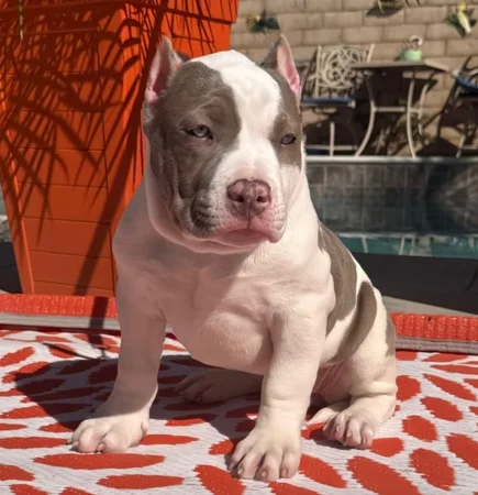 A stunning female bully with striking markings, balanced structure, and exceptional gentle temperament.
